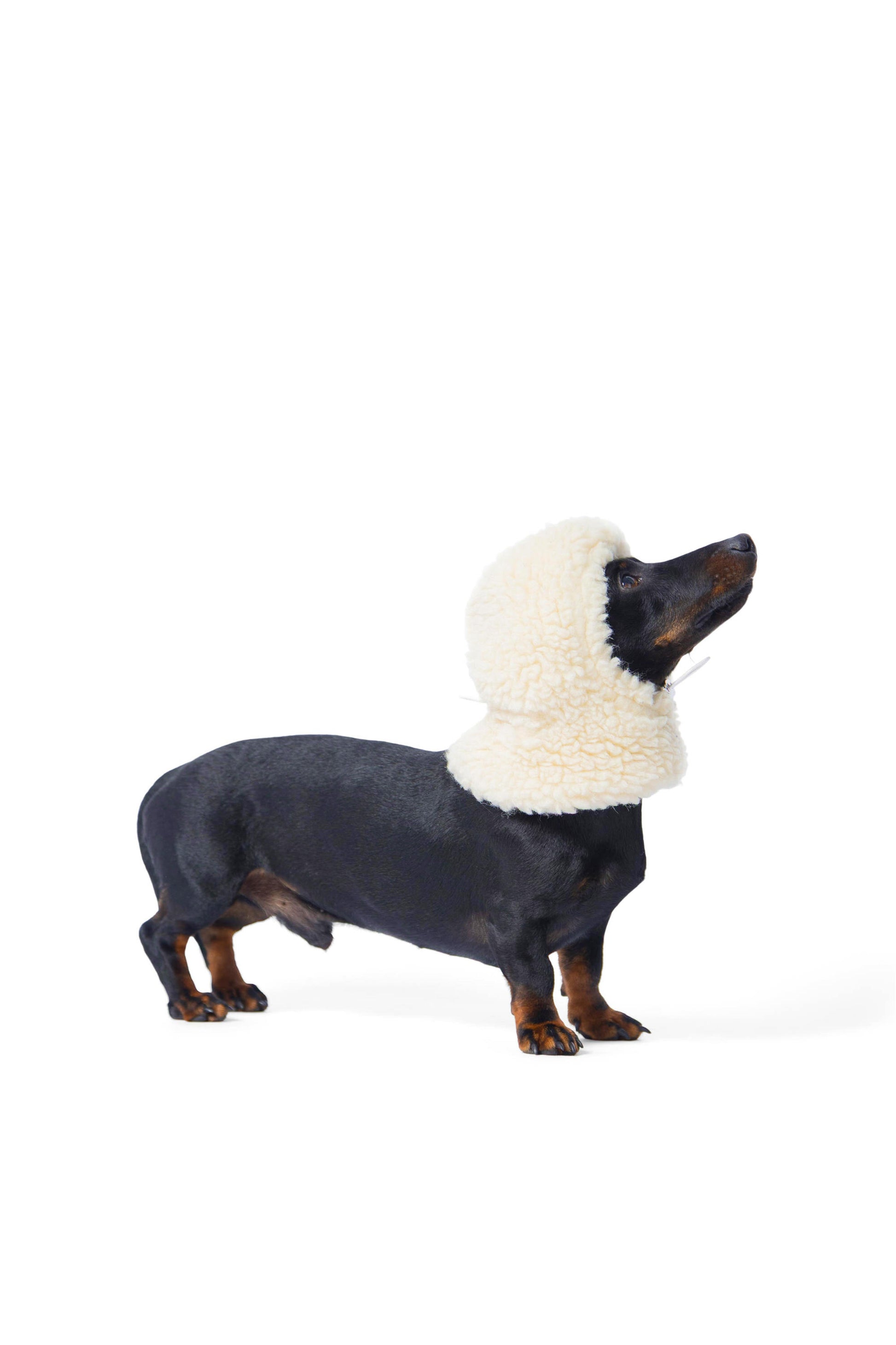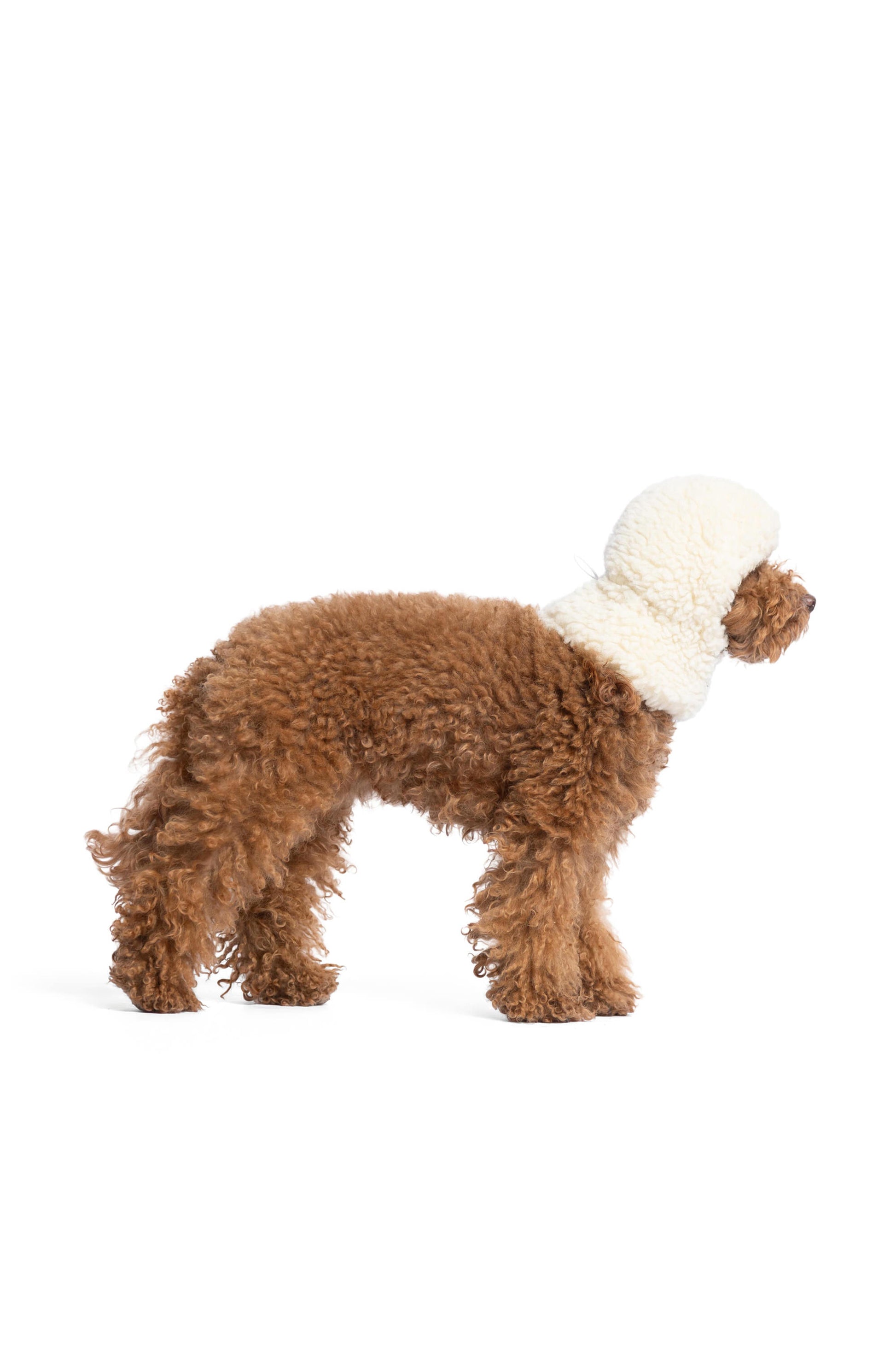 La cagoule en laine bouclée pour chien est disponible en trois tailles (XS, S, M) couvrant l’ensemble des races de chiens (voir dimensions ci-dessous).