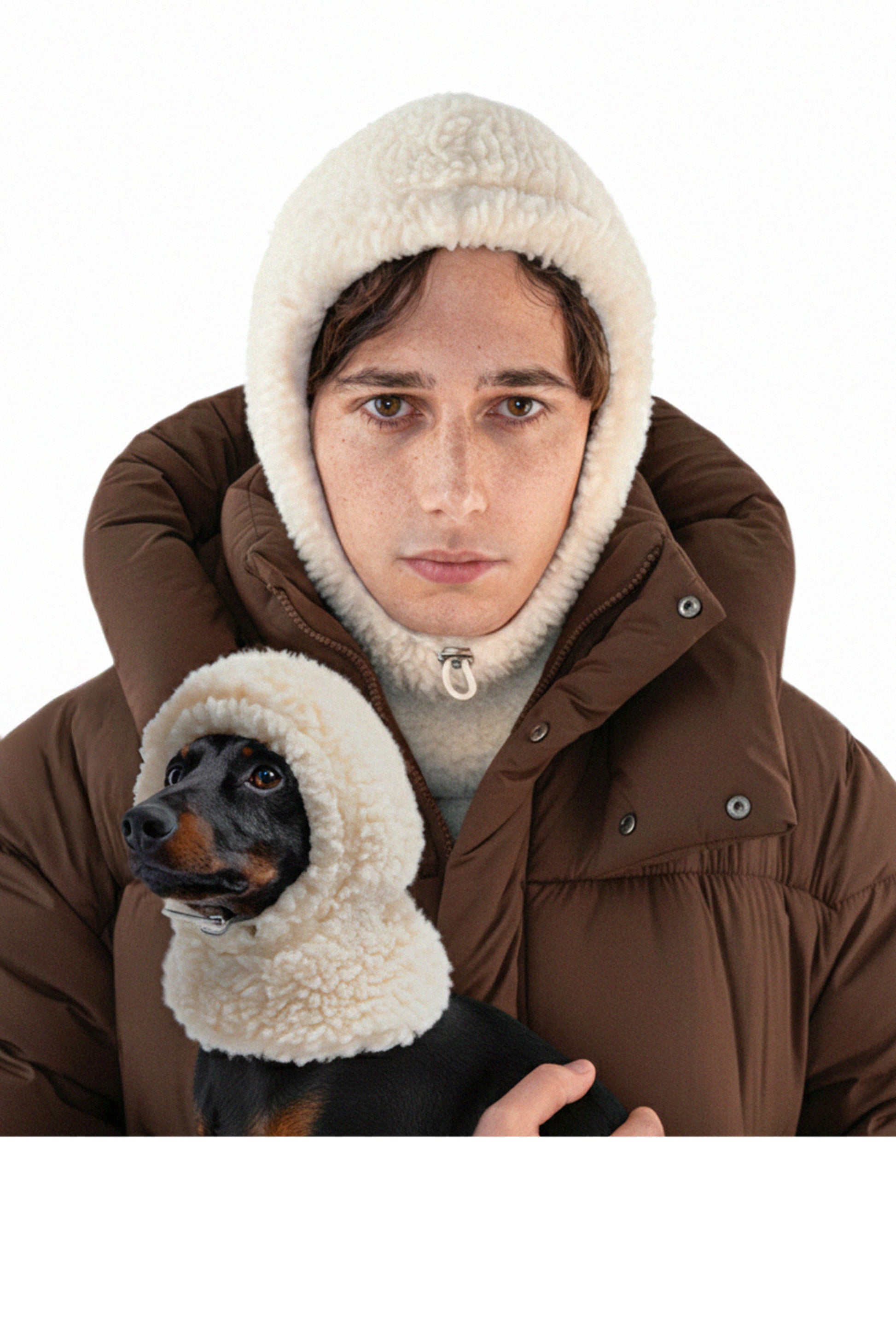 La cagoule en laine bouclée pour chien est disponible en trois tailles (XS, S, M) couvrant l’ensemble des races de chiens (voir dimensions ci-dessous).