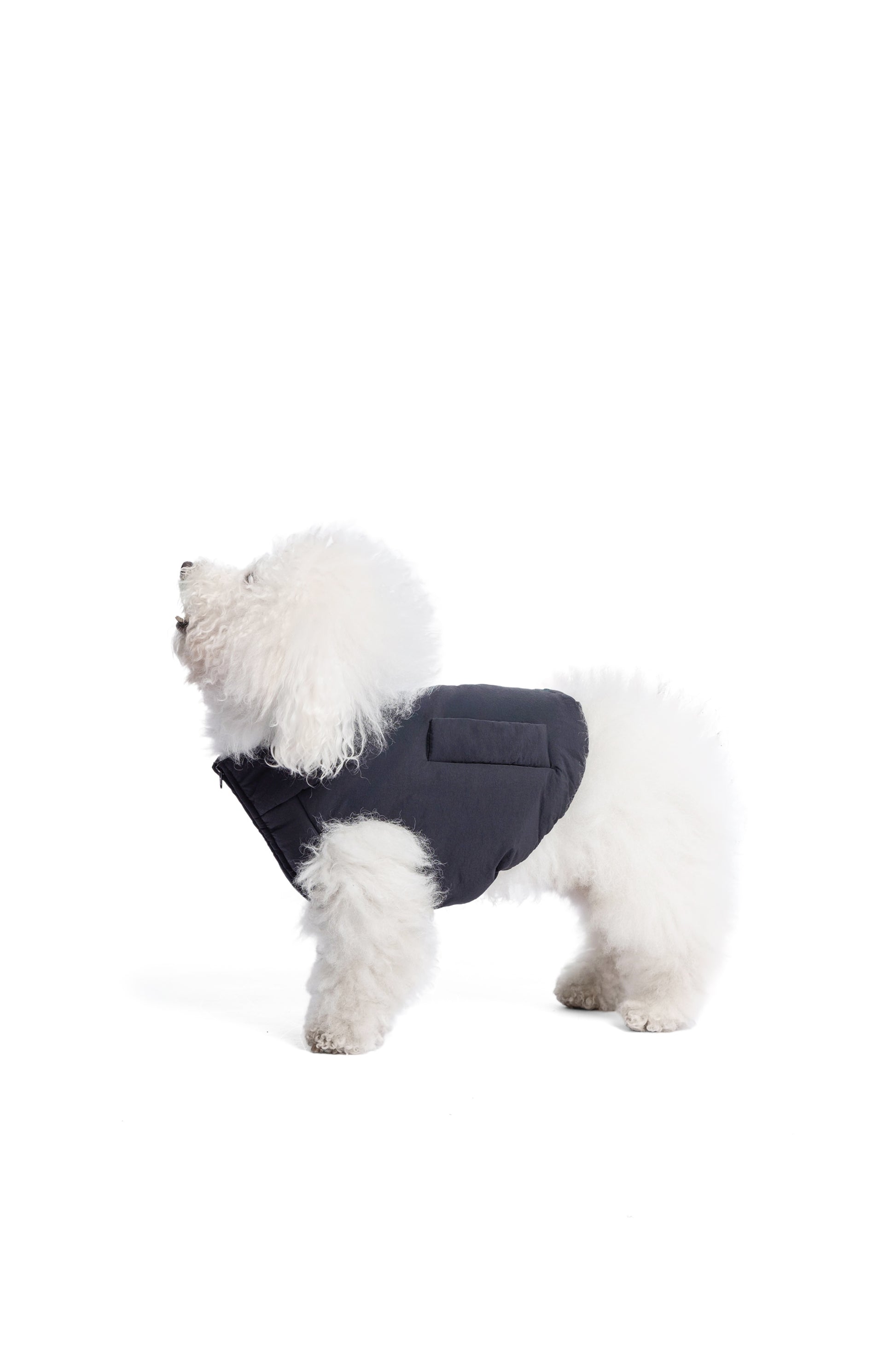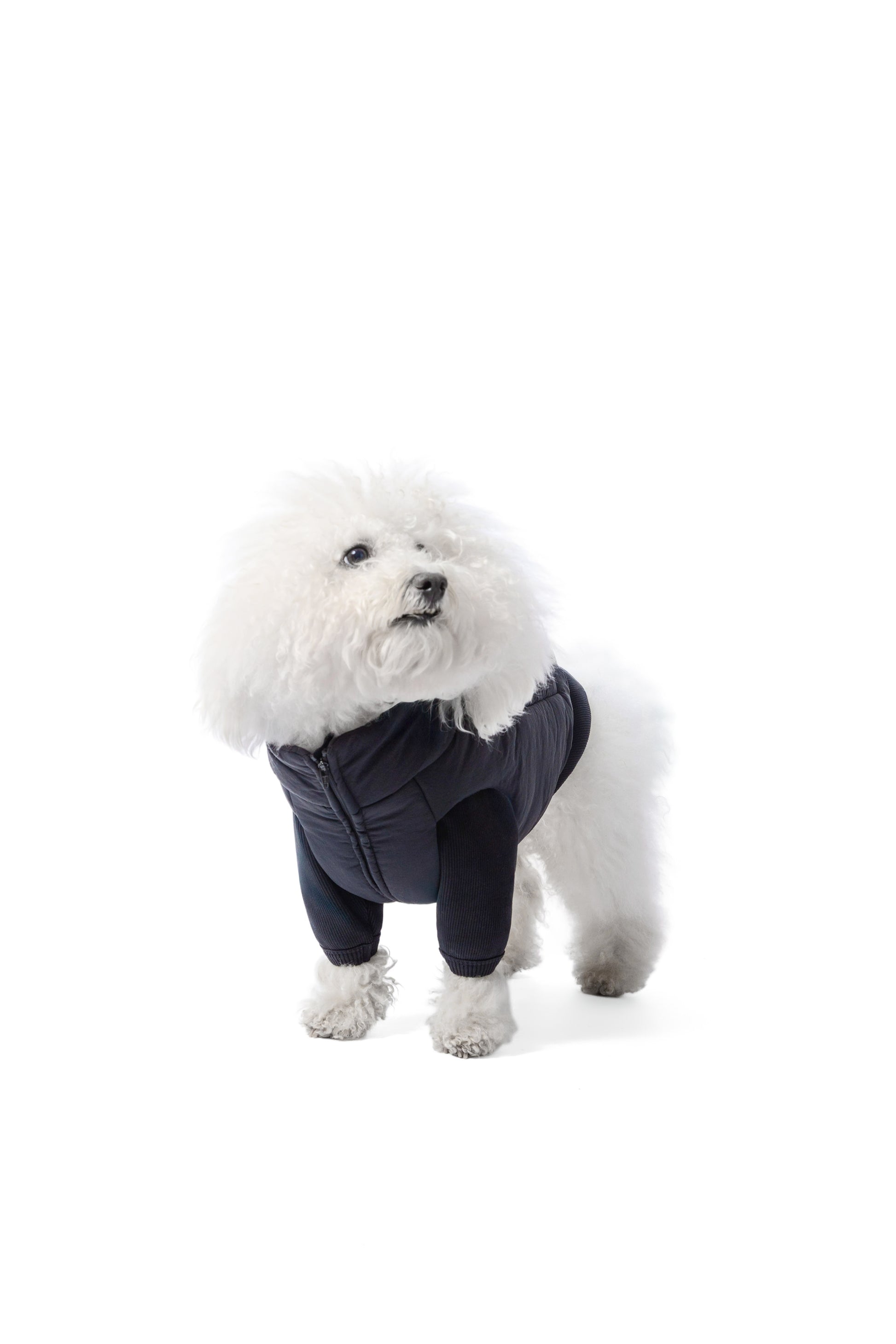– Bilbo est un bichon bolonnais qui pèse 5 kg et porte le T-shirt noir en taille M et la doudoune sans manches noire en taille M (prendre en compte l'épaisseur des poils)