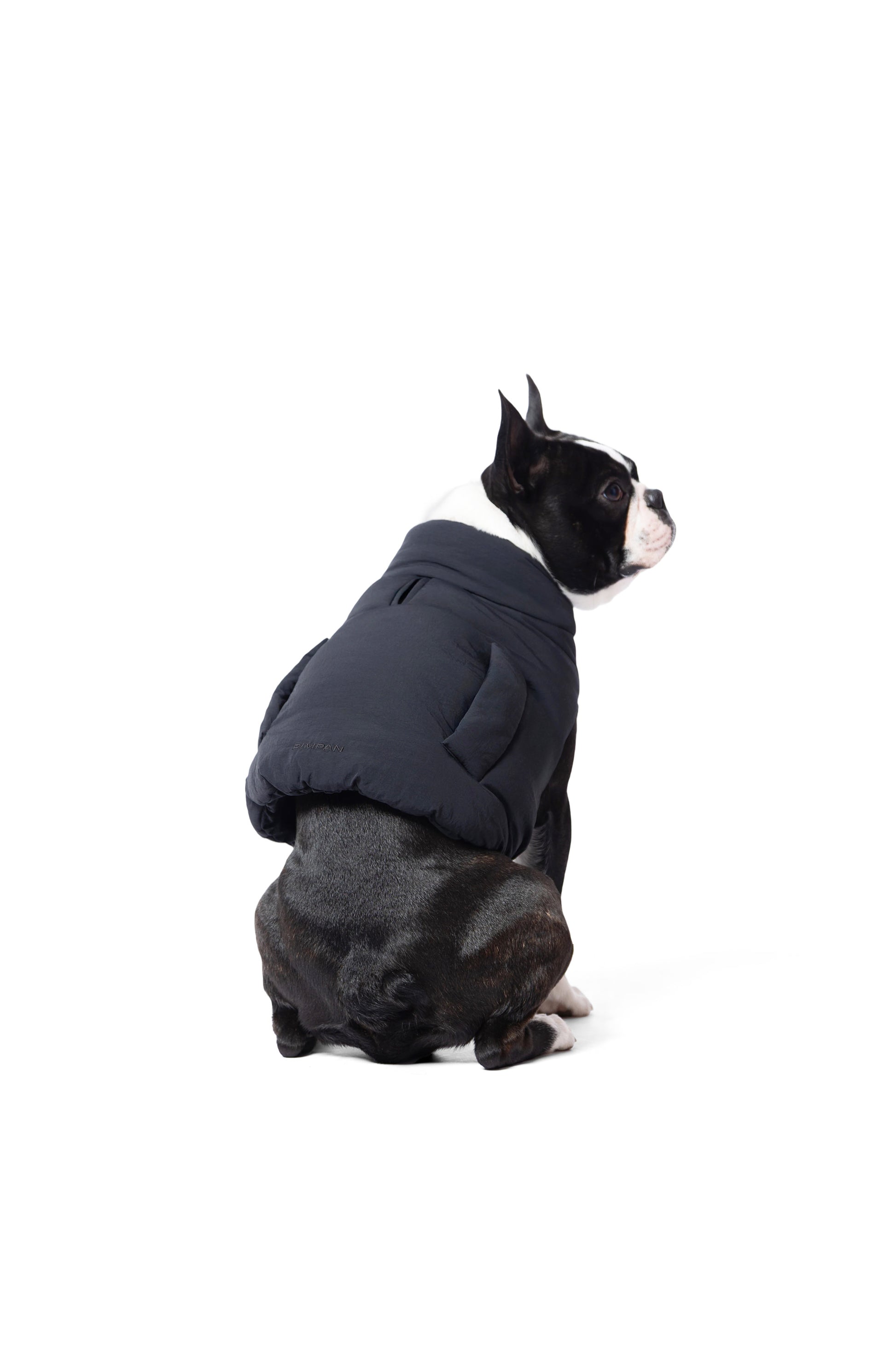 – Flash est un bulldog français qui pèse 10 kg et porte le T-shirt noir en taille M et la doudoune sans manches noire en taille M