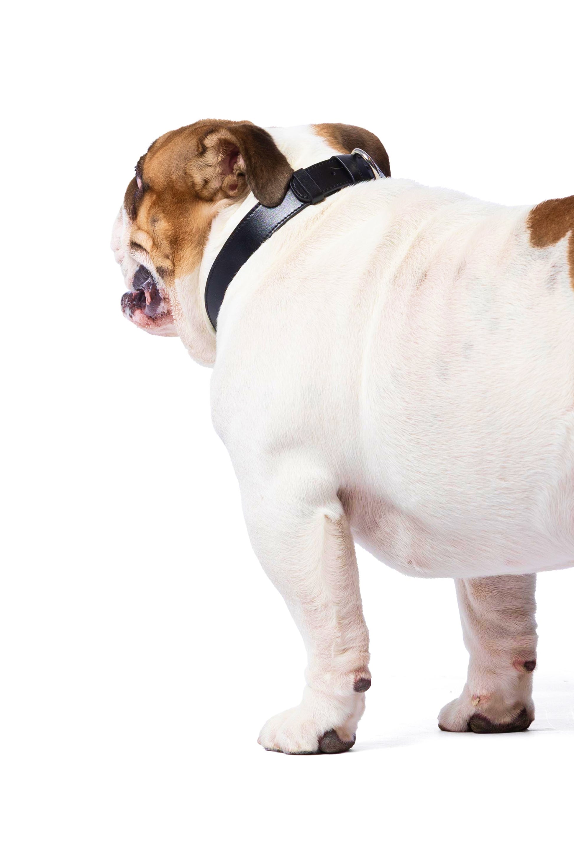 – Bruce est un bulldog anglais qui pèse 25 kg et porte le collier en taille L