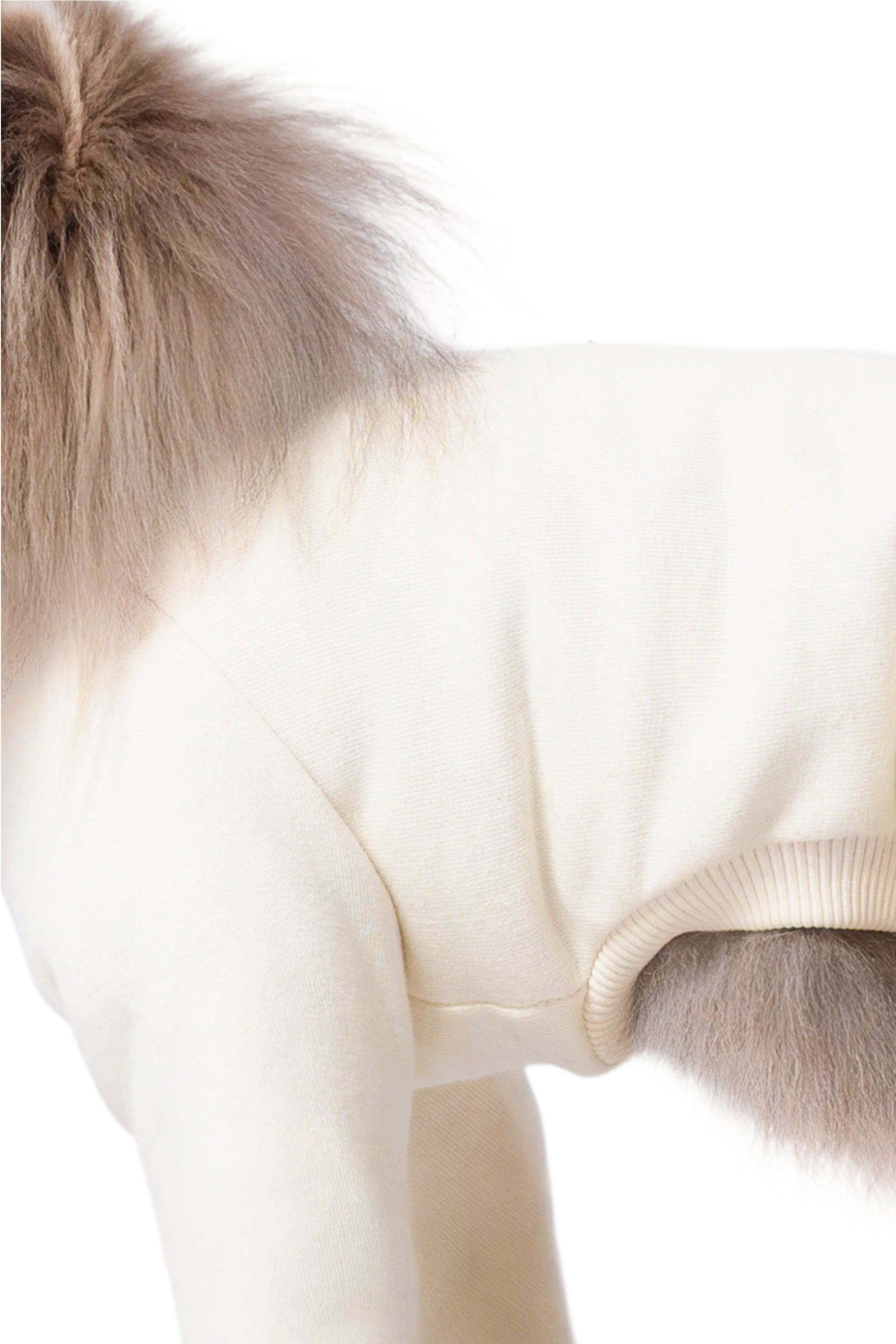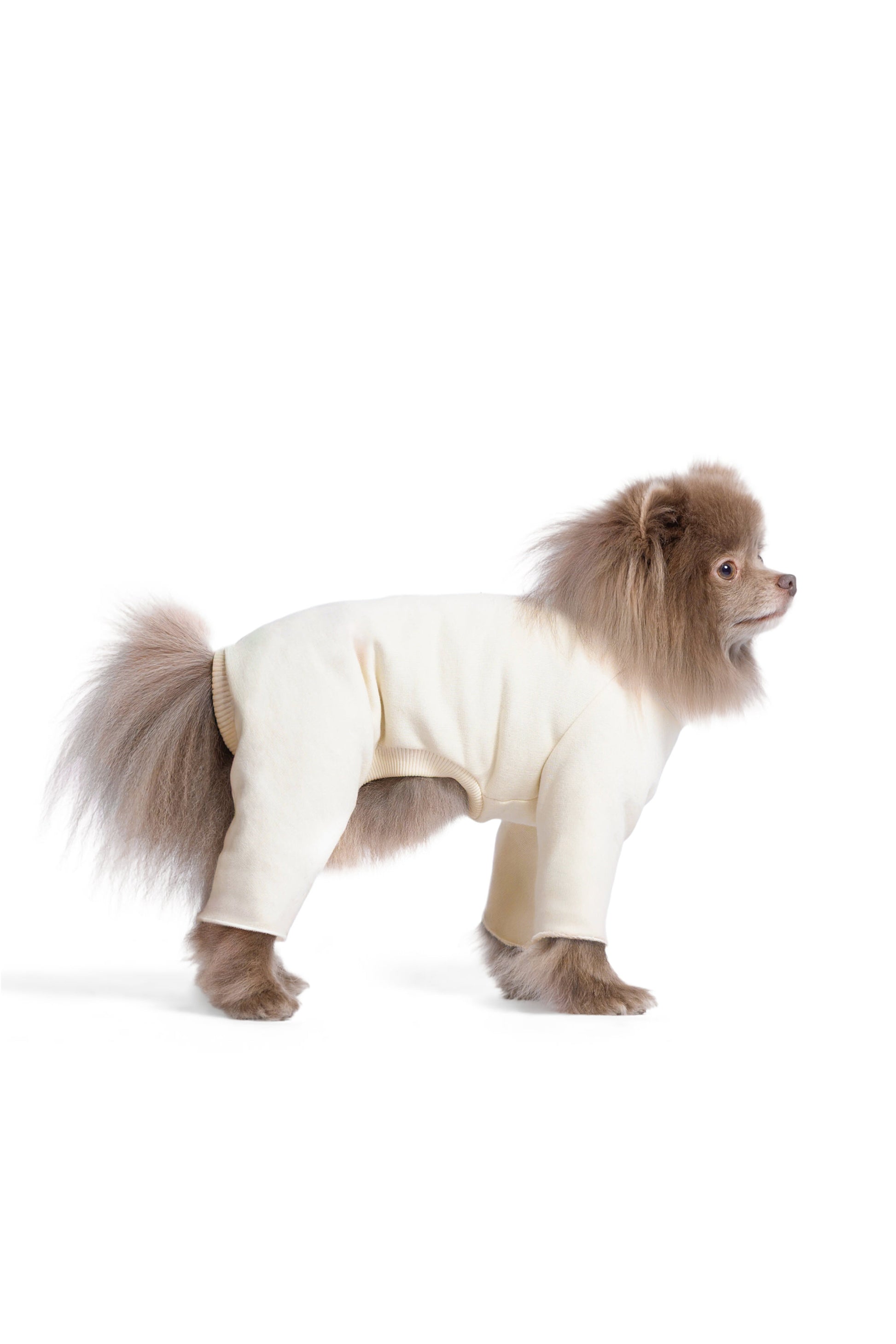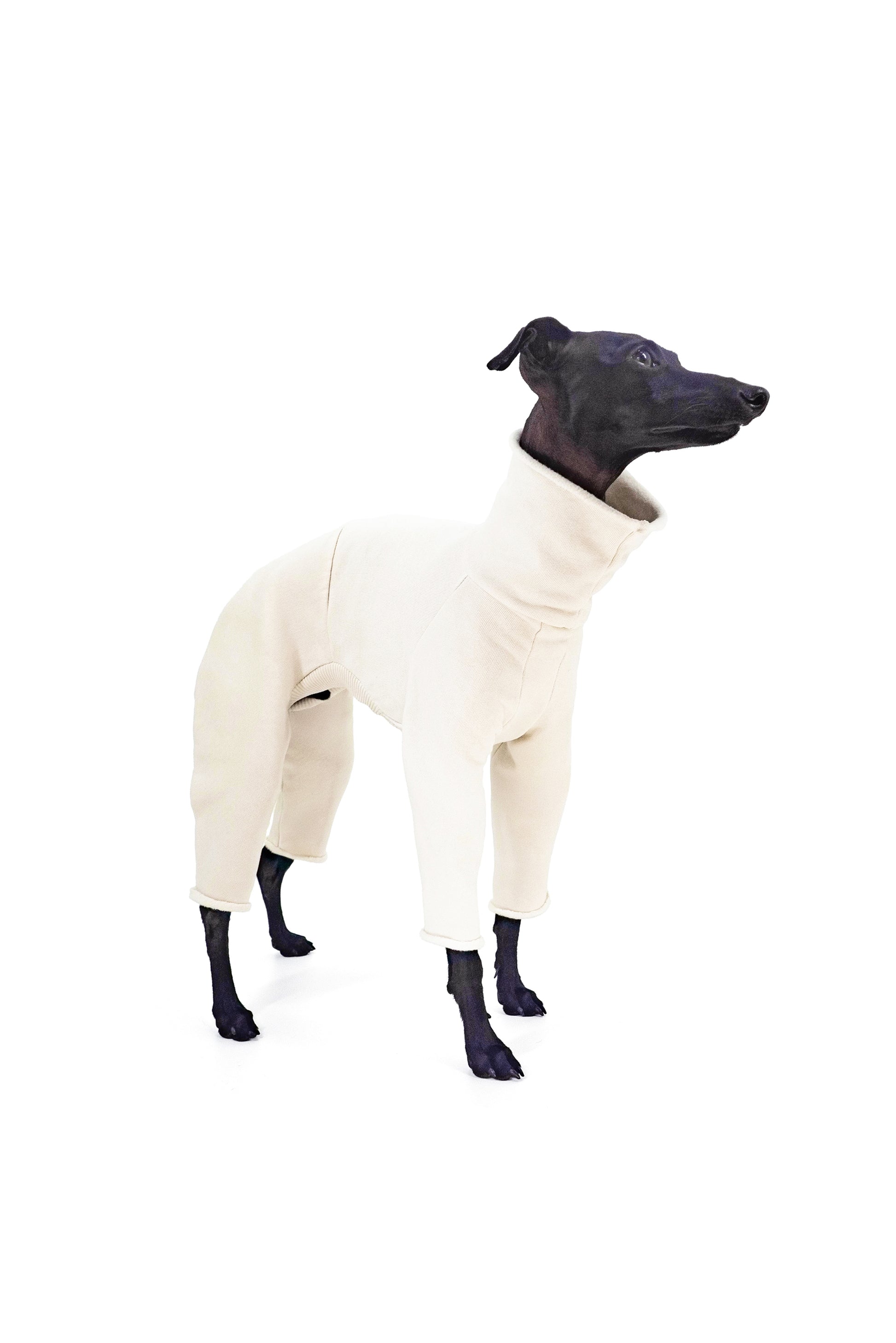 – Yoko est un petit lévrier italien qui pèse 5 kg et porte la combinaison écrue en taille IGGY