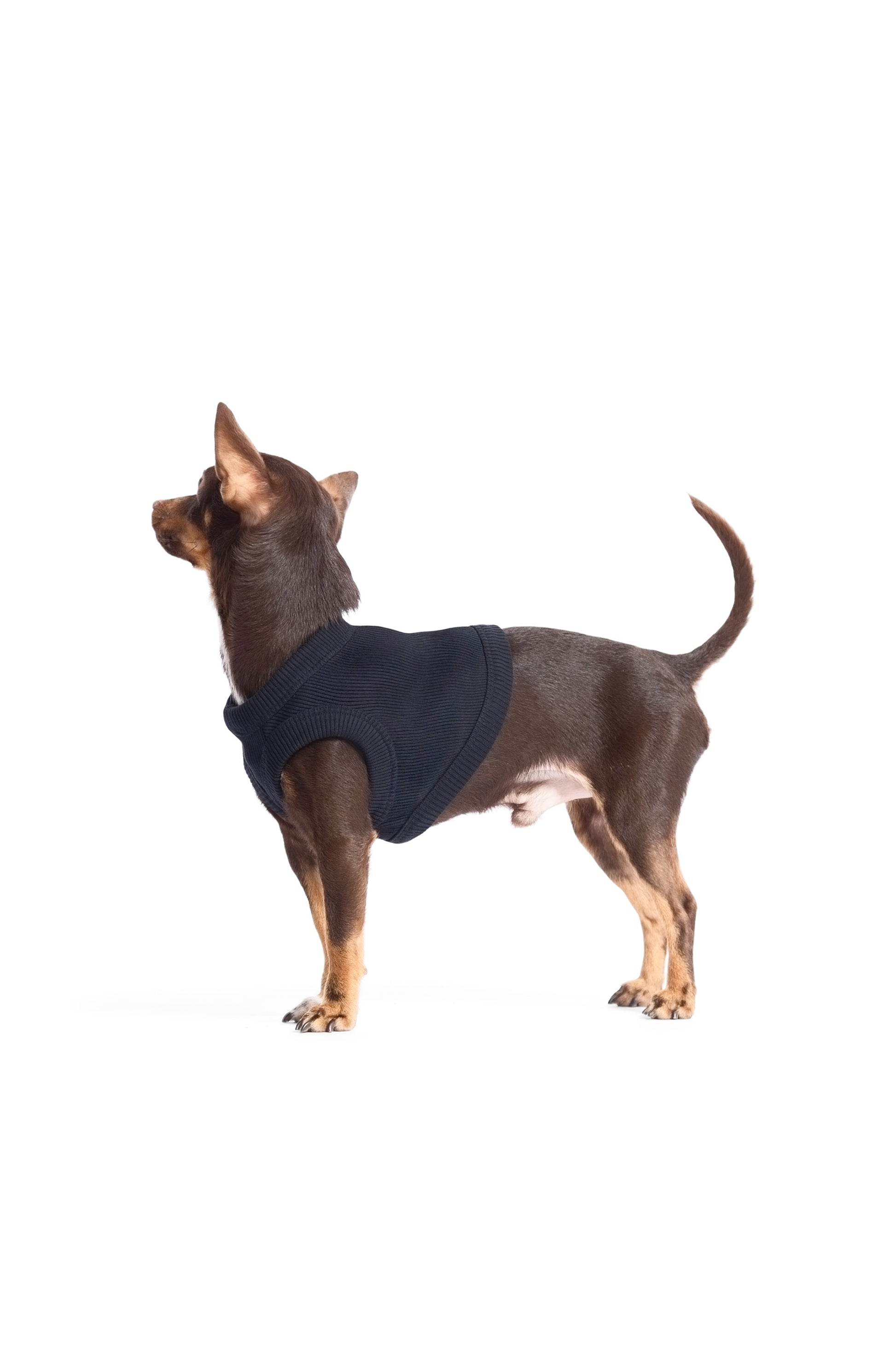 – Georges est un pinscher nain qui pèse 2,7 kg et porte le débardeur noir en taille XS