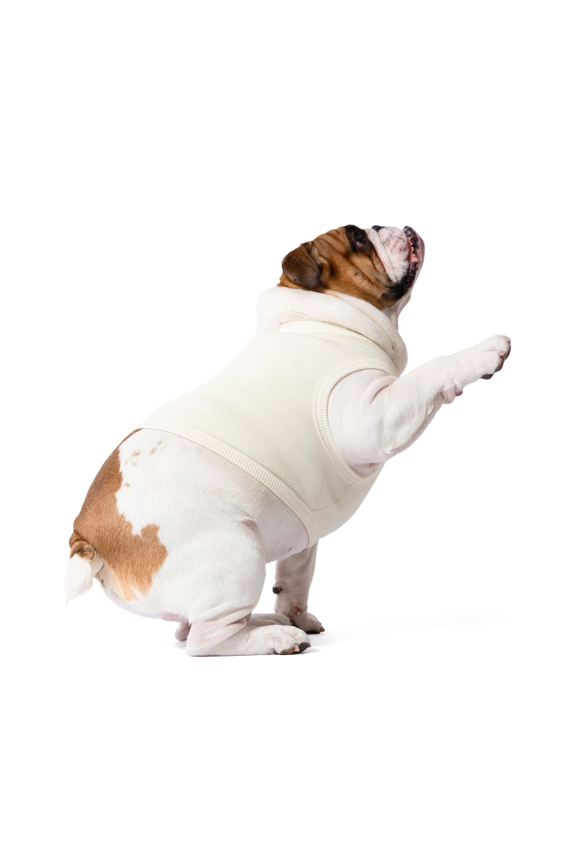 – Bruce est un bulldog anglais qui pèse 25 kg et porte le débardeur écru en taille L