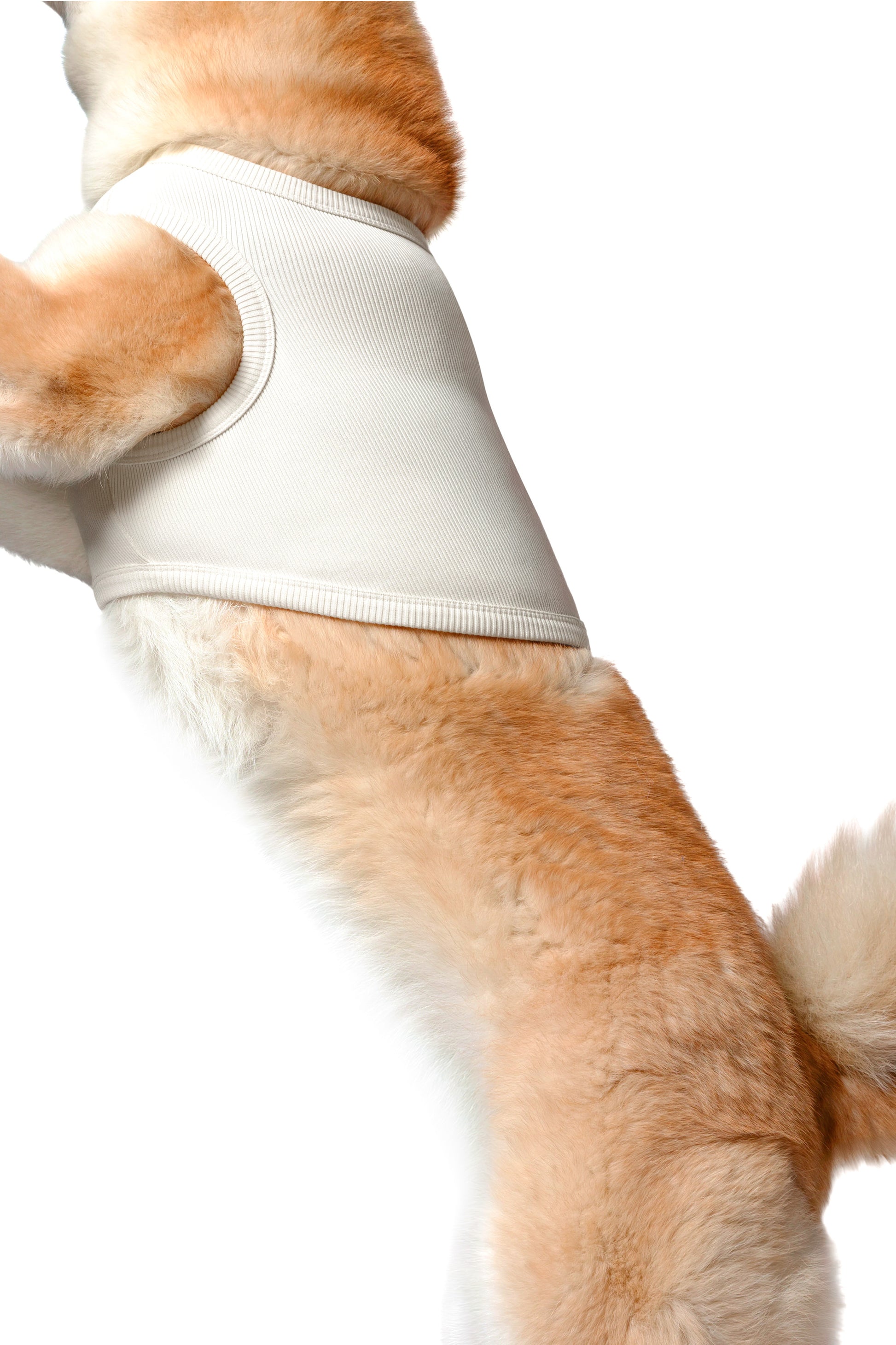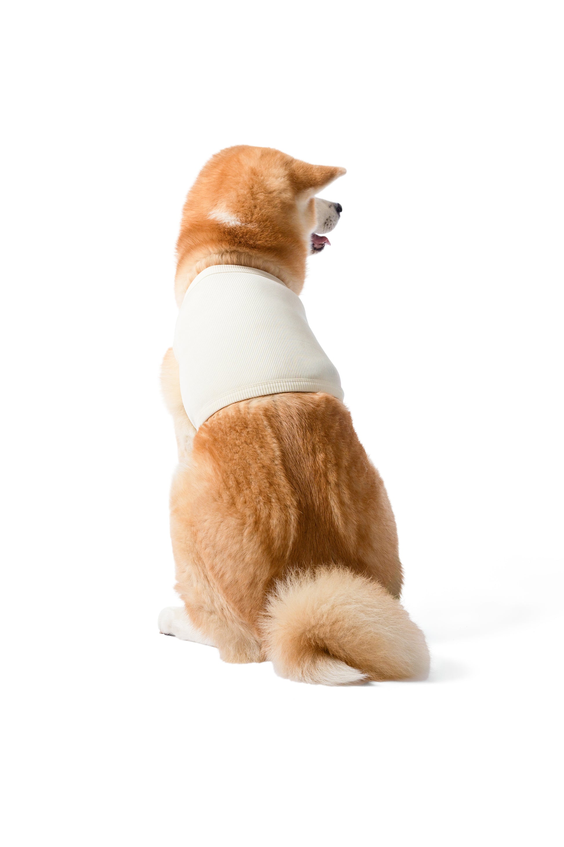 – Snow est une akita qui pèse 25 kg et porte le débardeur écru en taille L