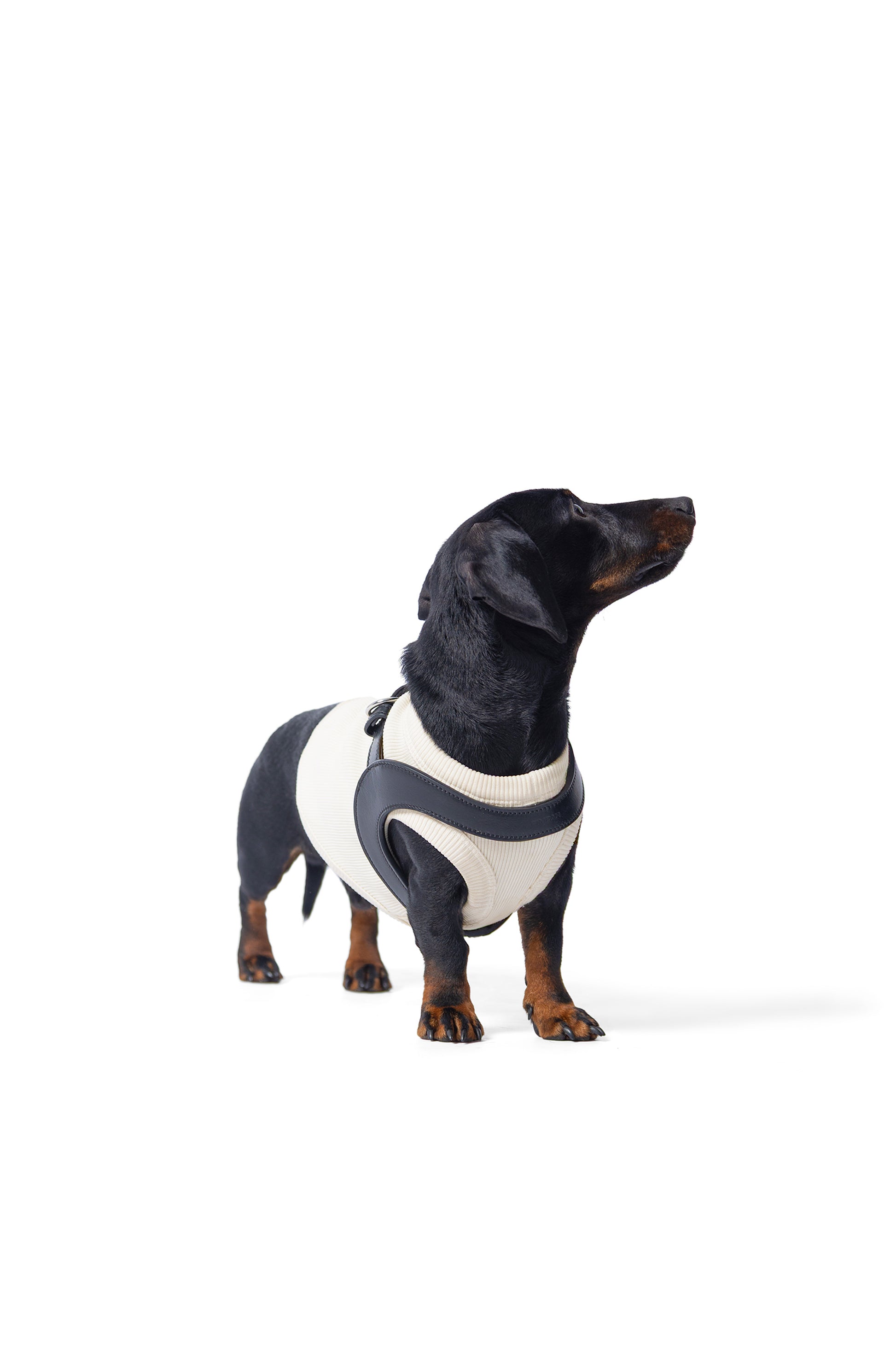 – Ulysse est un teckel nain qui pèse 5 kg et porte le harnais en taille S au dessus du débardeur écru en taille S