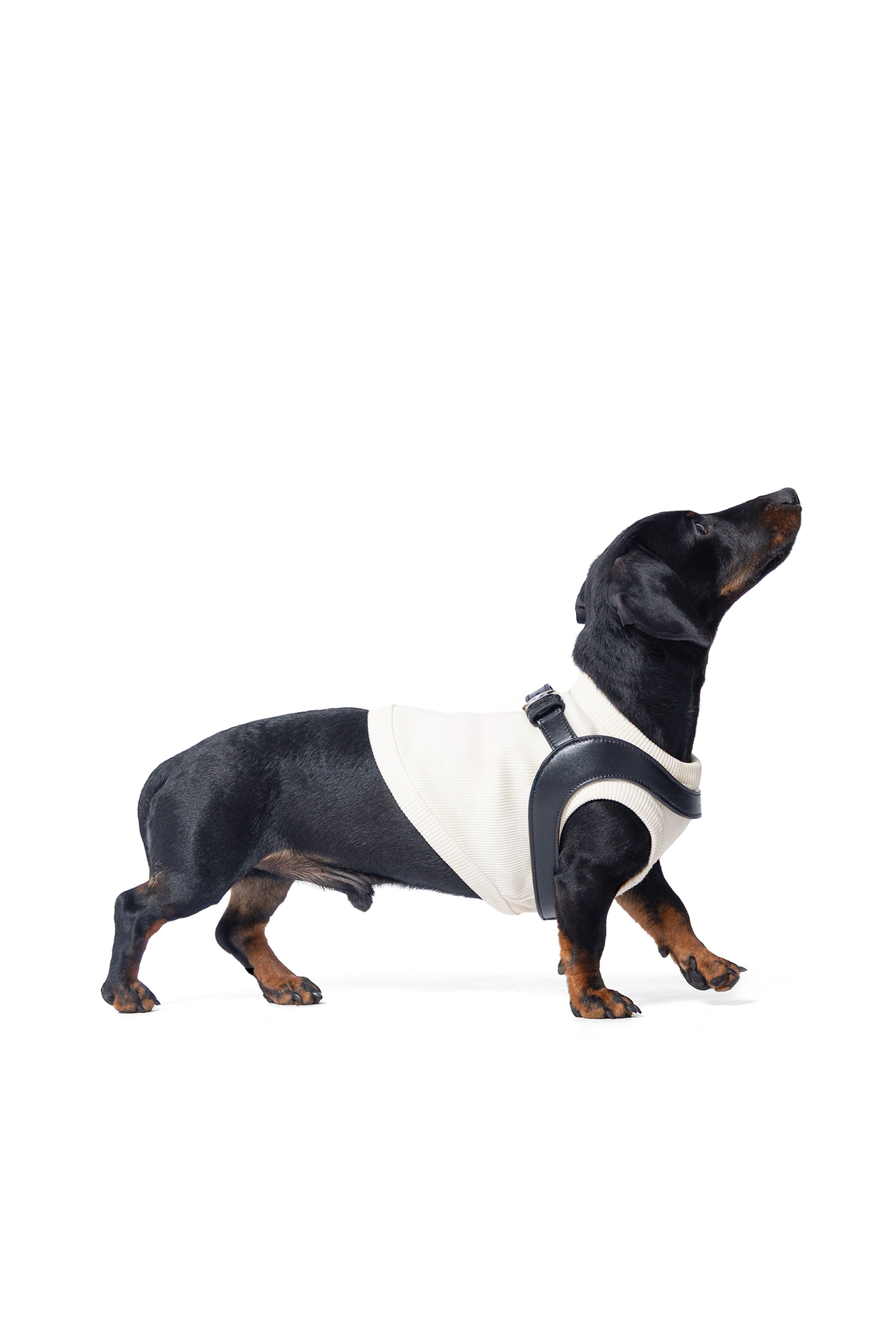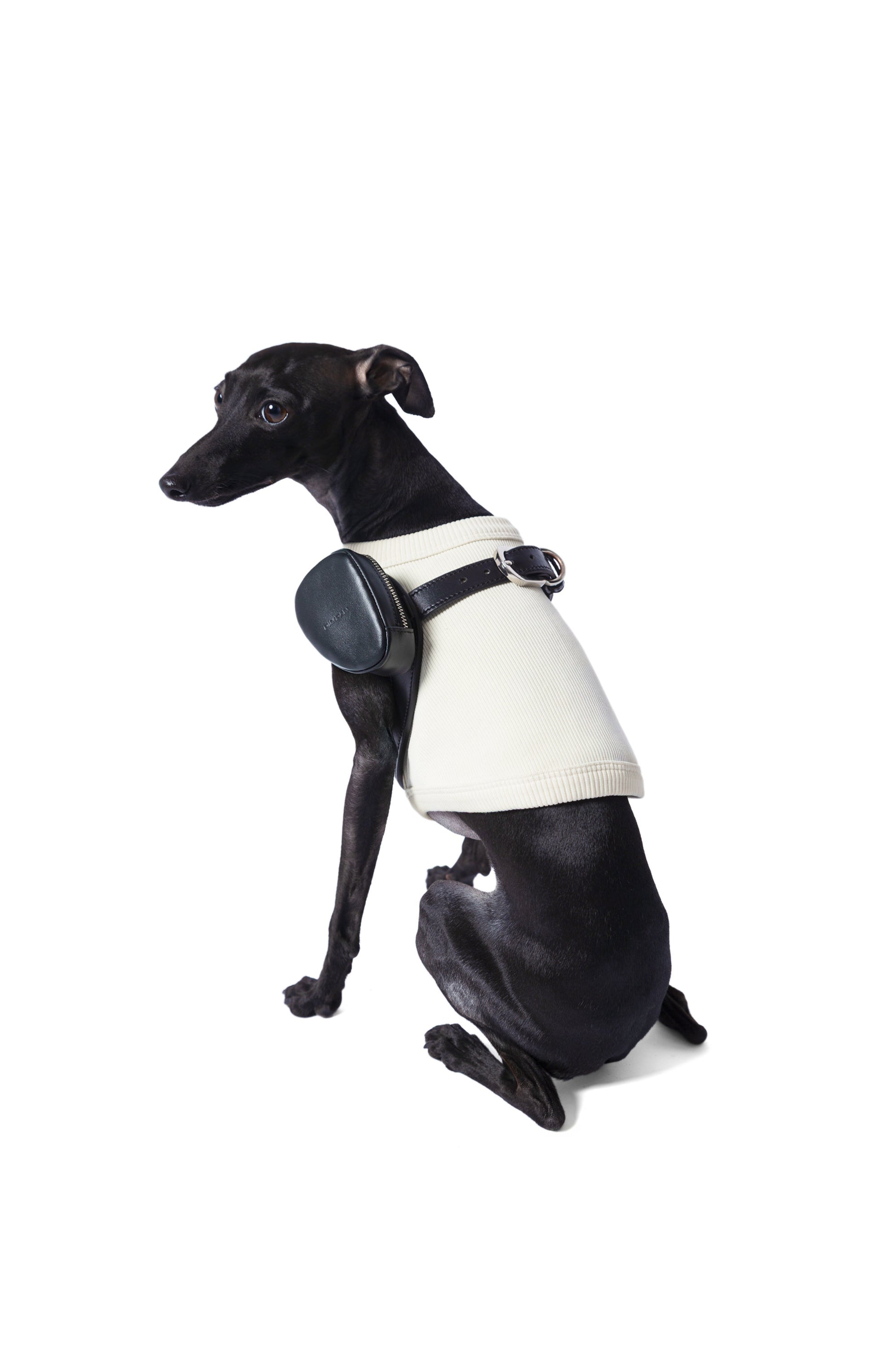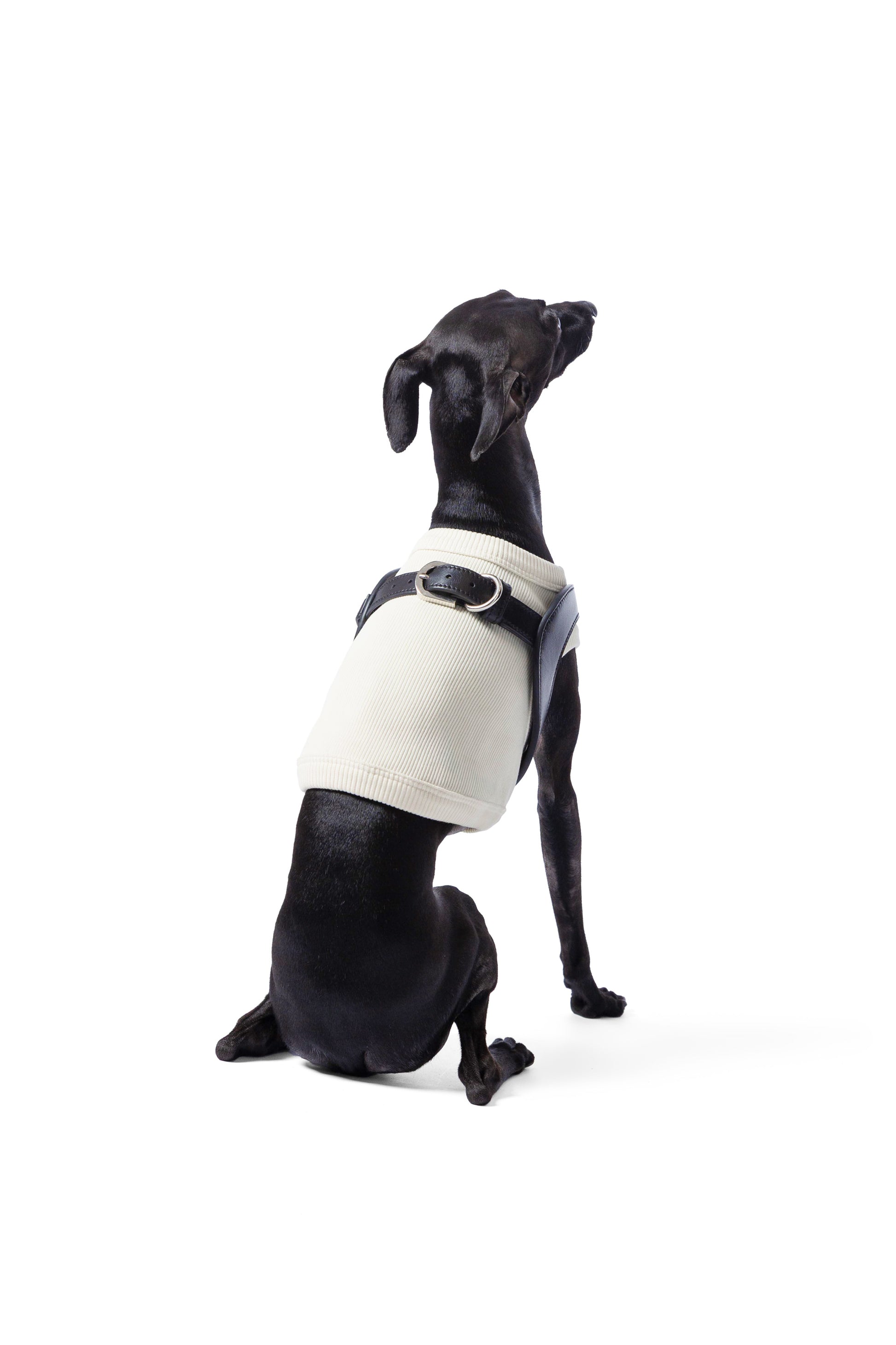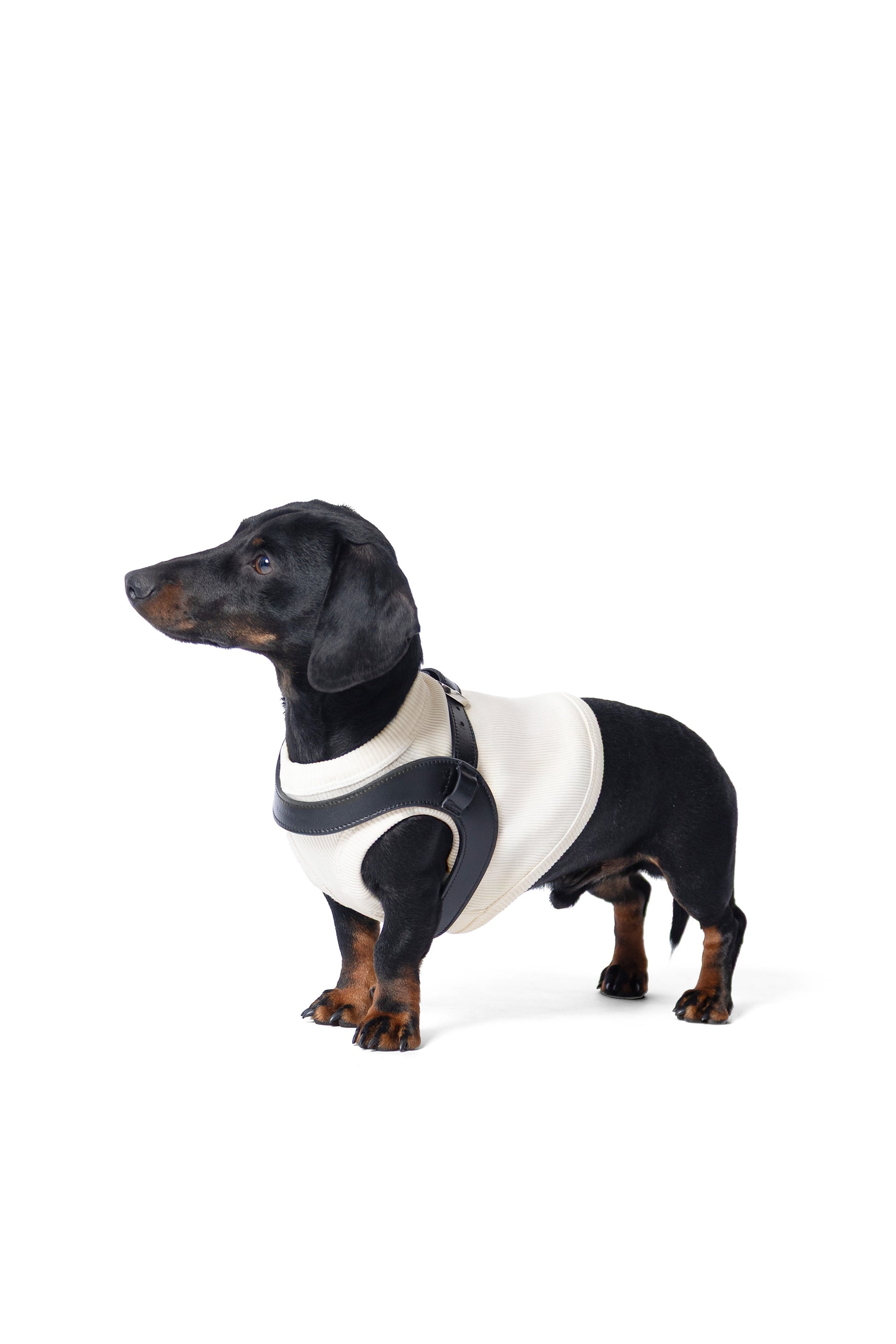 – Yoko est un petit lévrier italien qui pèse 5 kg et porte le harnais en taille S accompagné de la pochette en cuir, au dessus du débardeur écru en taille S