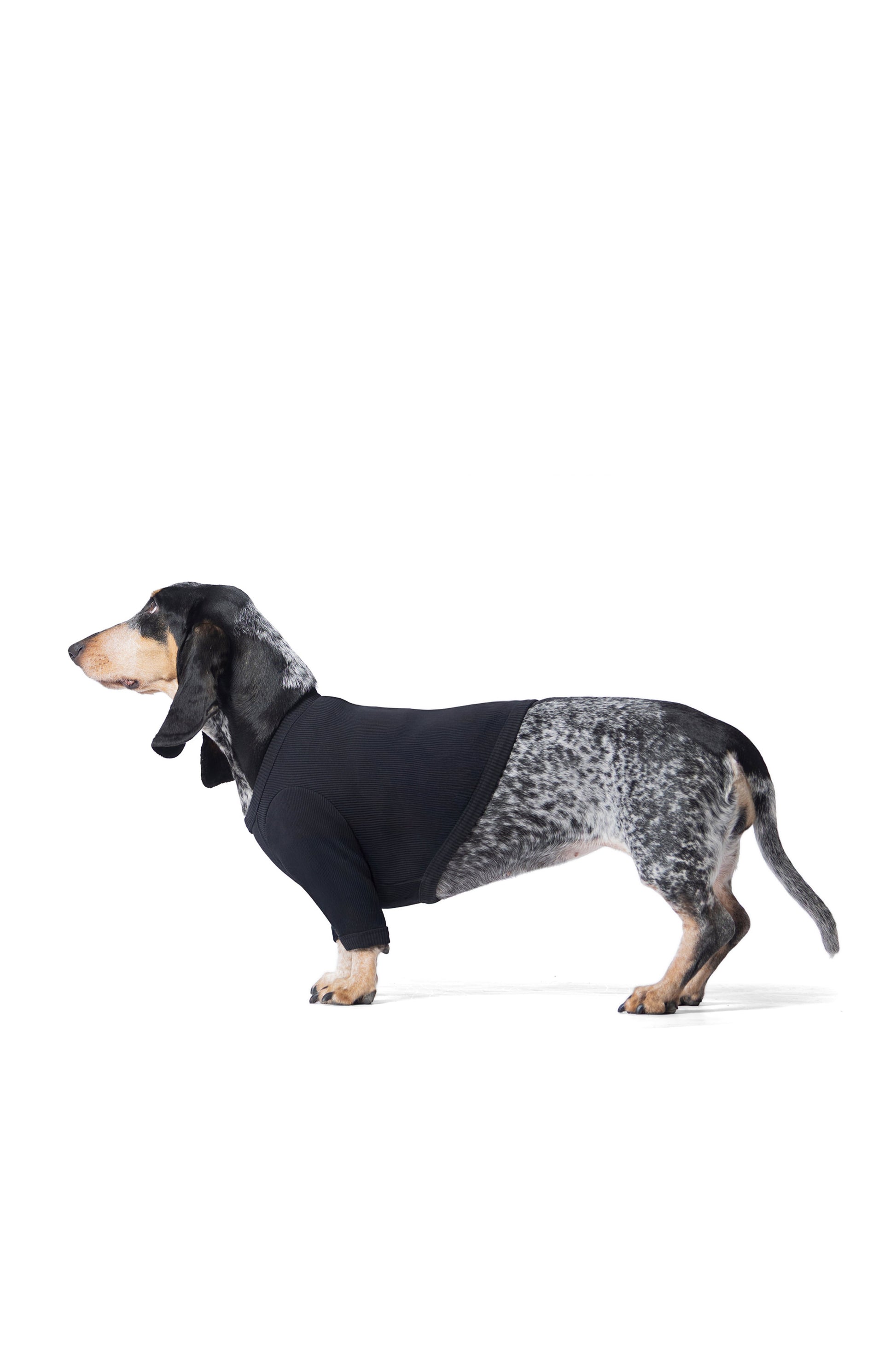 – Yofi est un basset qui pèse 16 kg et porte le T-shirt noir en taille M