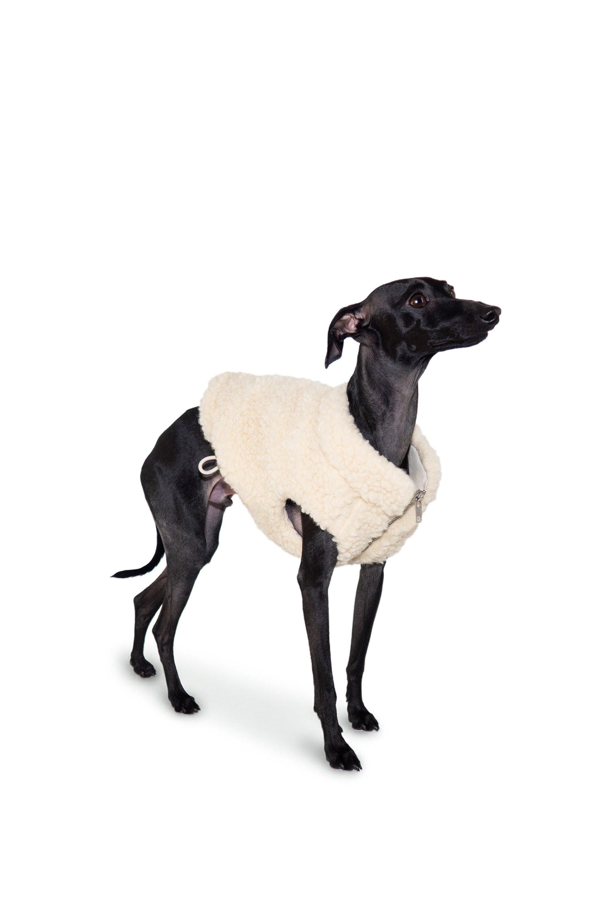 – Yoko est un petit lévrier italien qui pèse 5 kg et porte la veste en laine bouclée en taille S
